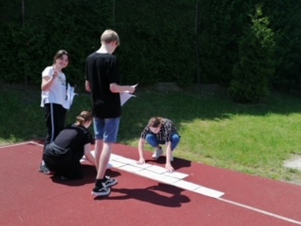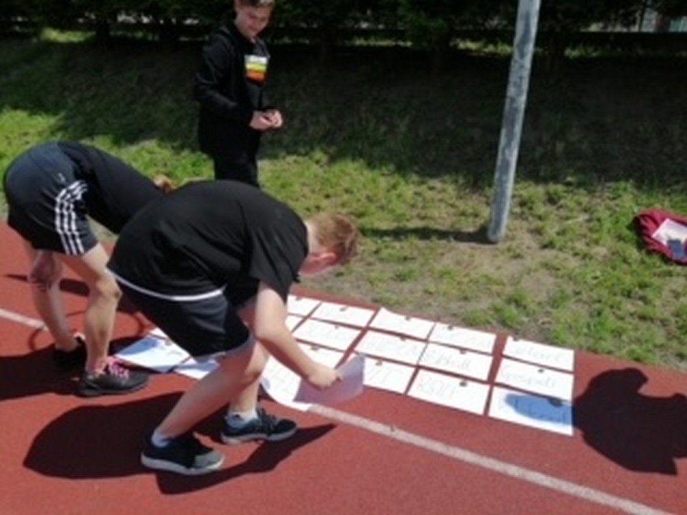 Lekcja języka niemieckiego w 8b odbyła się na świeżym powietrzu. Pracując w grupach uczniowie bawili się, powtarzali materiał i budowali na nowo relacje koleżeńskie.