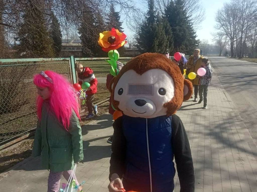 W barwnym korowodzie przemaszerowali alejkami i uliczkami Mościc niosąc kolorowe balony, kwiaty. Towarzyszyła im również postać Marzanny. Roześmiany i barwny korowód wzbudzał zainteresowanie korzystających z pogody przechodniów.