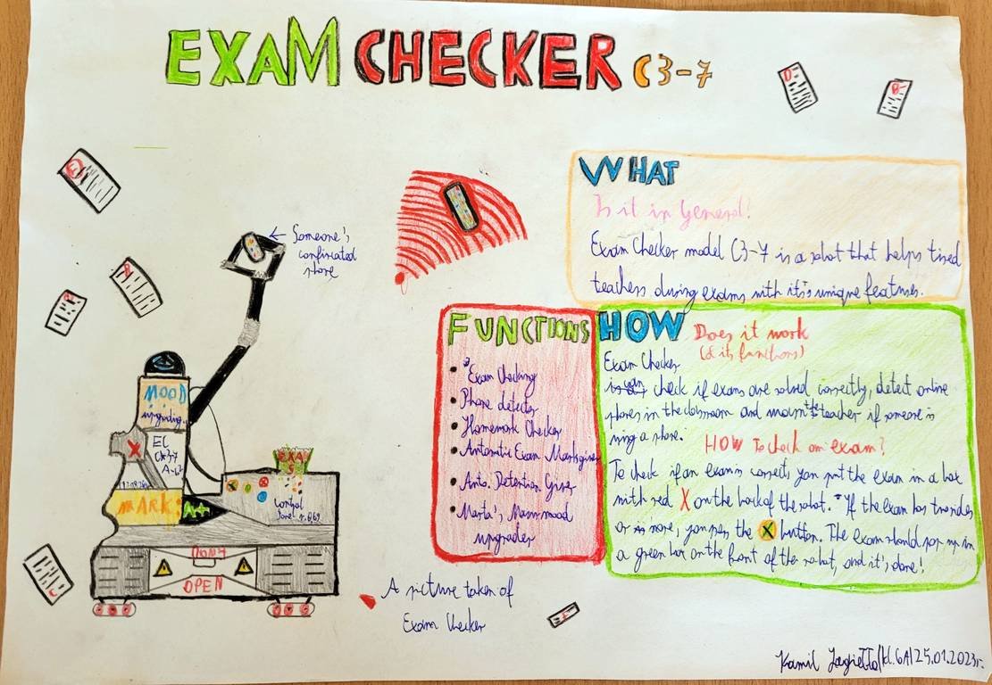 Były więc roboty od "brudnej roboty" czyli prania , sprzątania, gotowania, roboty od zadań domowych, styliści, ekolodzy, kelnerzy, poprawiające nastrój, a hitem był robot poprawiający sprawdziany i czuwający nad prawidłowym ich przebiegiem. „Myślę, że ten ostatni bardzo by mi się przydał” – skwitowała nasza pani anglistka Marta Mazur.