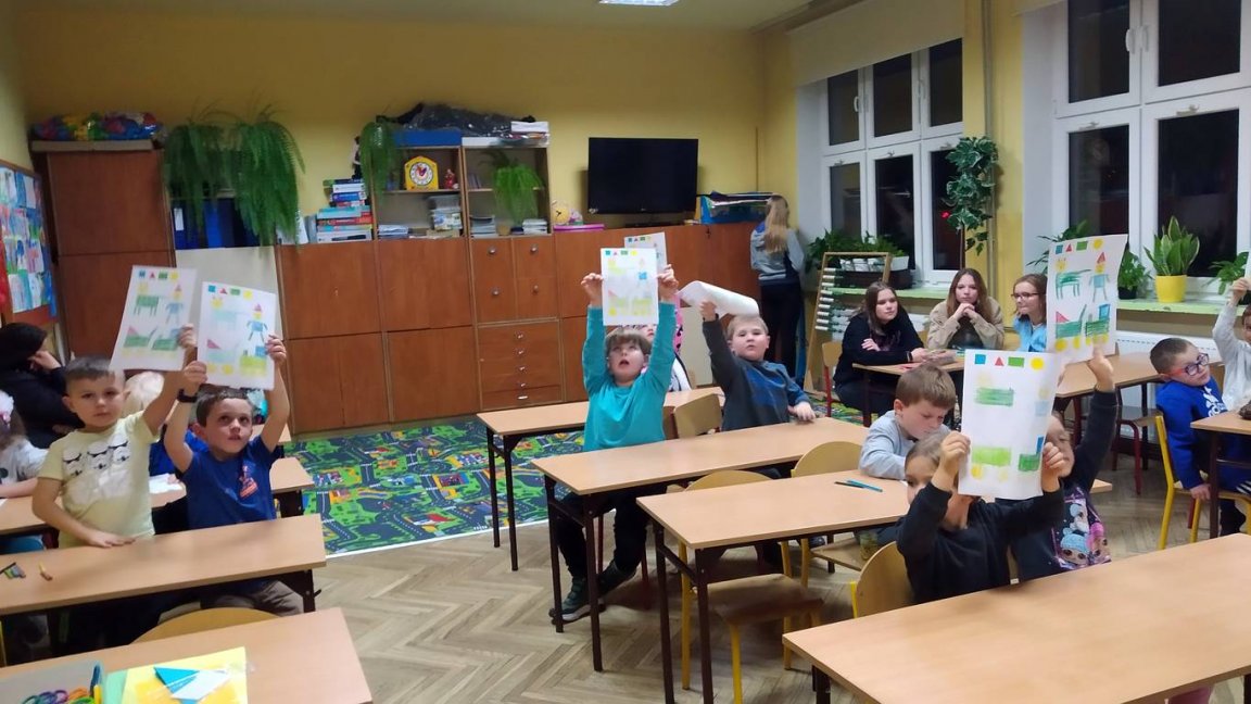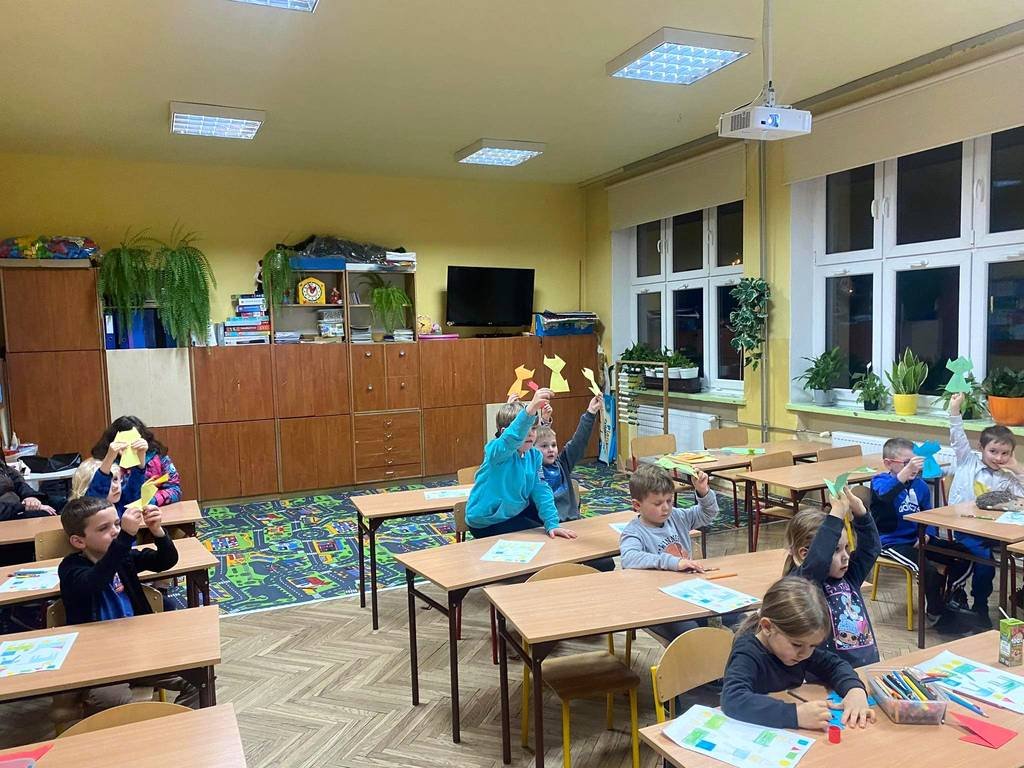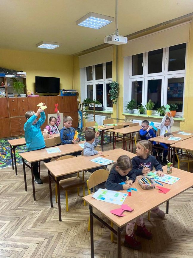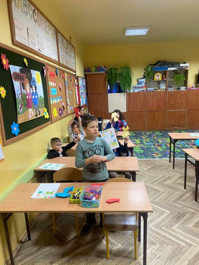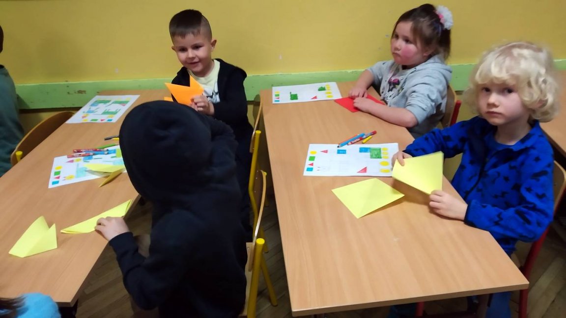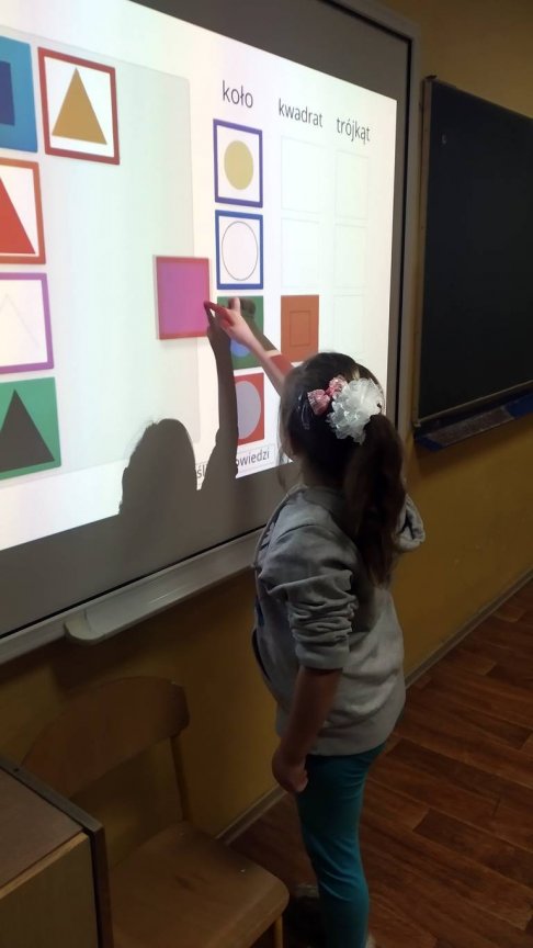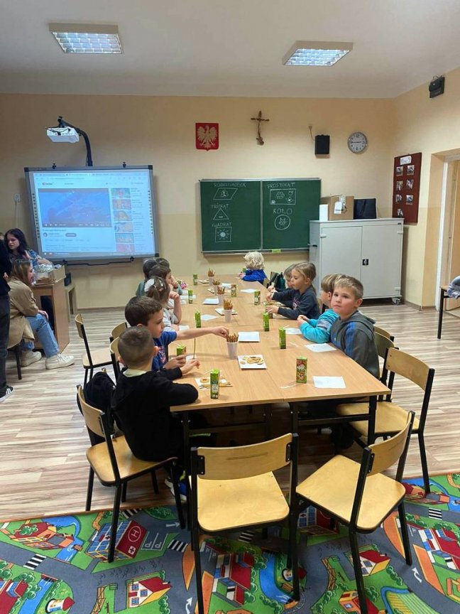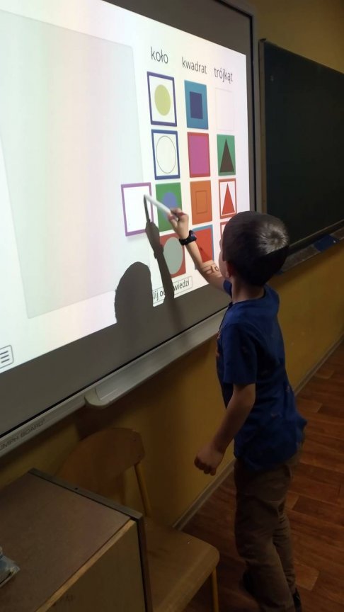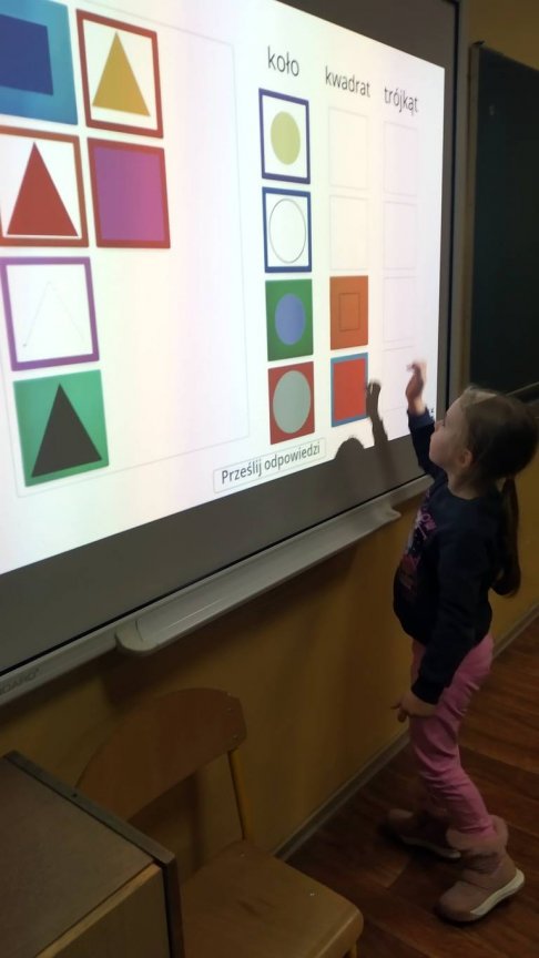Dzieci wykonały 2 prace plastyczne związane z poznanymi figurami, m.in. kotka z origami, bawiły się w kodowanie️, a na tablicy multimedialnej sprawdzały swoją wiedzę z zakresu poznanych figur. Kręcąc interaktywnym Kołem Fortuny miały okazję poruszać się wykonując wylosowane polecenia ćwiczeń ruchowych. Wszytkie zadania dzieciaki wykonały perfekcyjnie. Pod opieką starszych kolegów i koleżanek z klasy 8c bawiliśmy się znakomicie przy znanych przedszkolakom piosenkach. Nie zabrakło również słodkiego poczęstunku. Do zobaczenia na kolejnych zajęciach.