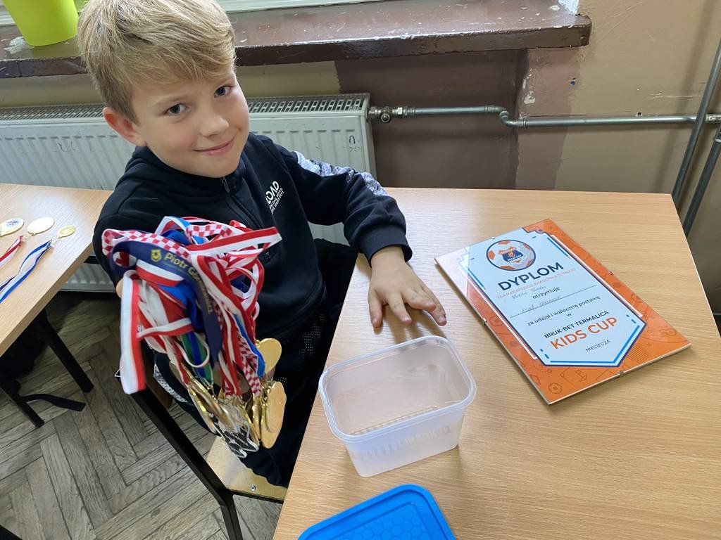 Młodzi piłkarze z zapartym tchem słuchali historii Tej słynnej olimpijki z 1992 roku. Na temat historii pierwszych olimpiad oraz spektakularnych osiągnięć swojej mamy bardzo ciekawie opowiadała córka p. Ewy - Oliwia Kalisz. Chłopcy mieli okazję oglądnąć masę pamiątek olimpijskich oraz podpytać panią Ewę jaki jest sposób na osiągnięcie tak wielkich sukcesów sportowych. Odpowiedź naszego gościa była jednoznaczna: ciężka praca. Tego dnia uczniowie przynieśli do klasy również swoje medale – te pierwsze w ich życiu, jak i te zdobyte całkiem niedawno. A dorobek młodych sportowców jest naprawdę imponujący.