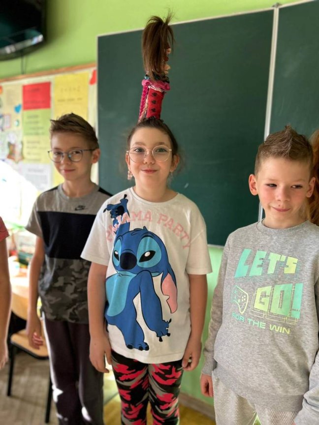 Uczniowie wykazali się fantazją przy projektowaniu wariacji na głowie: gniazdo, duża palma, wizerunek kota okazały się najciekawszymi pomysłami.