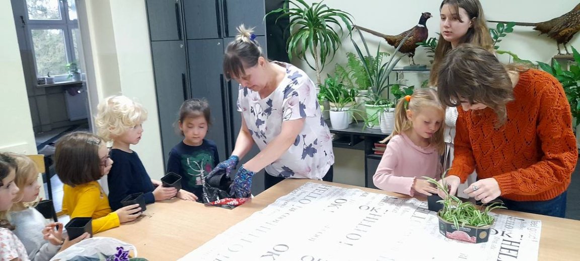 Tematem przewodnim spotkania były zmiany zachodzące w przyrodzie jesienią. Przedszkolaki wykazały się dużą znajomością zwyczajów zwierząt związanych z przygotowaniem do zimy. Dzieci uczyły się różnic między drzewami iglastymi i liściastymi. Poznały budowę liścia pojedynczego i złożonego. Sortowały liście według kształtów i kolorów, poznawały nazwy gatunków drzew liściastych. Przyporządkowywały owoce do gatunków drzew. Następnie z użyciem liści wykonały niezwykle atrakcyjne prace plastyczne metodą frotażu, rozpoznawały również barwy ciepłe. Po krótkiej przerwie na „małe co nieco” dzieci poznały gatunki kwiatów z tropików, które spotykamy w naszych domach, w uprawie całorocznej. Sadziły rozłogi zielistki, aloesy i liście fiołka afrykańskiego, które zabrały do swoich domowych hodowli. Dużym zainteresowaniem cieszyły się kwiatowe puzzle układane na szkolnych komputerach w pracowni informatycznej oraz zabawa w łapanie świetlików na tablicy multimedialnej. Nasi mali goście dużo się nauczyli i świetnie się przy tym bawili. Do zobaczenia na kolejnych spotkaniach.