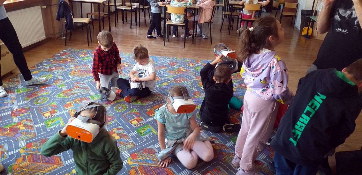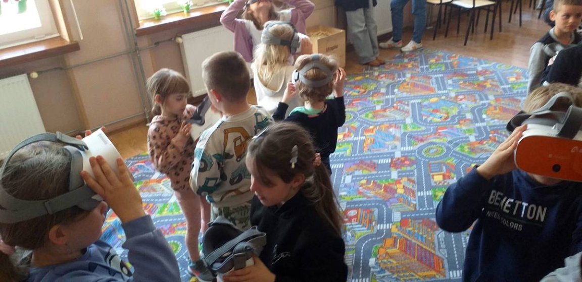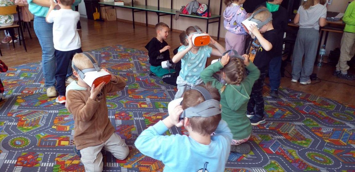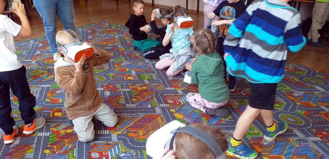 Przedszkolaki chętnie zadawały pytania, próbowały swoich sił w prostych układankach na tabletach graficznych. Dzieci były zafascynowane możliwościami gogli 3D gdzie w ułamku sekundy bardzo realistycznie przenosiły się w rożne miejsca na naszej planecie. Zajęcia przebiegły w radosnej atmosferze, a dzieci opuszczały szkołę z uśmiechami na twarzy i głowami pełnymi nowych wrażeń.