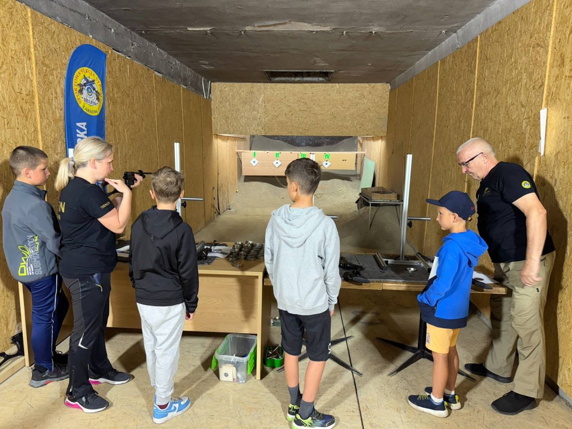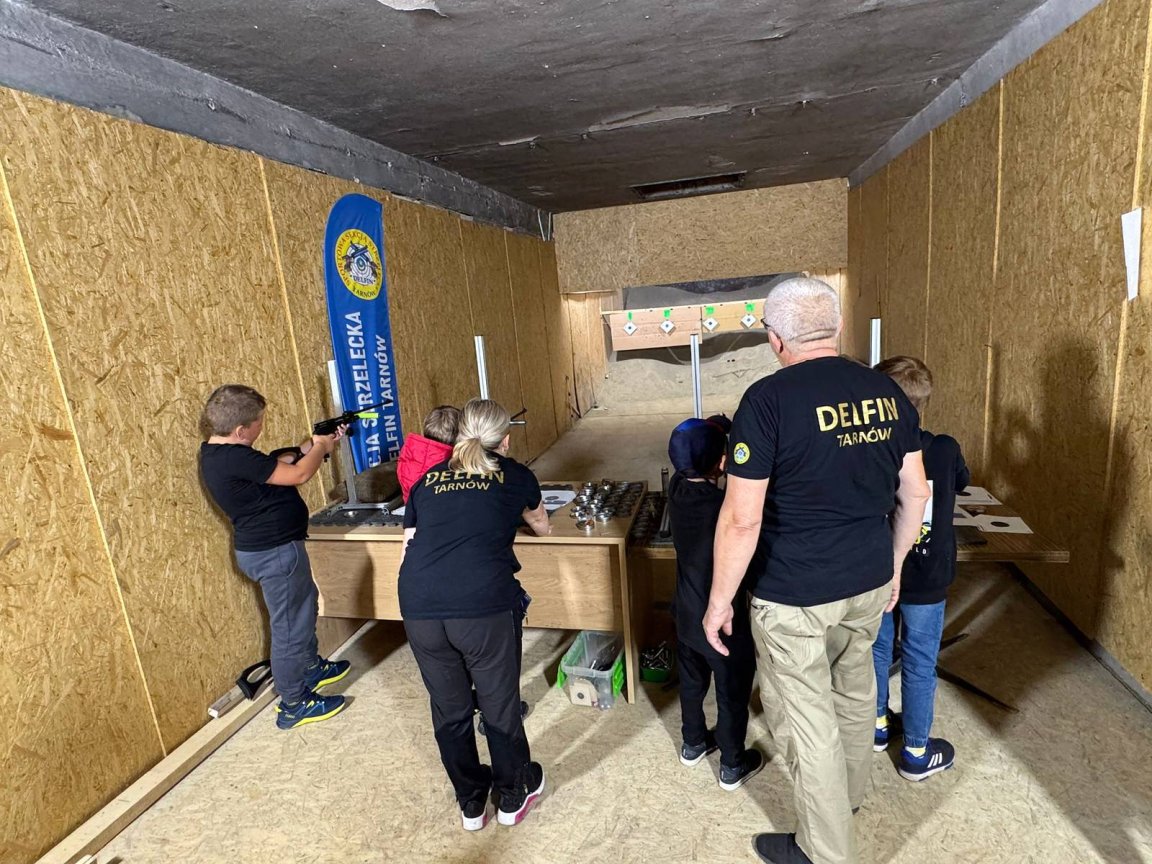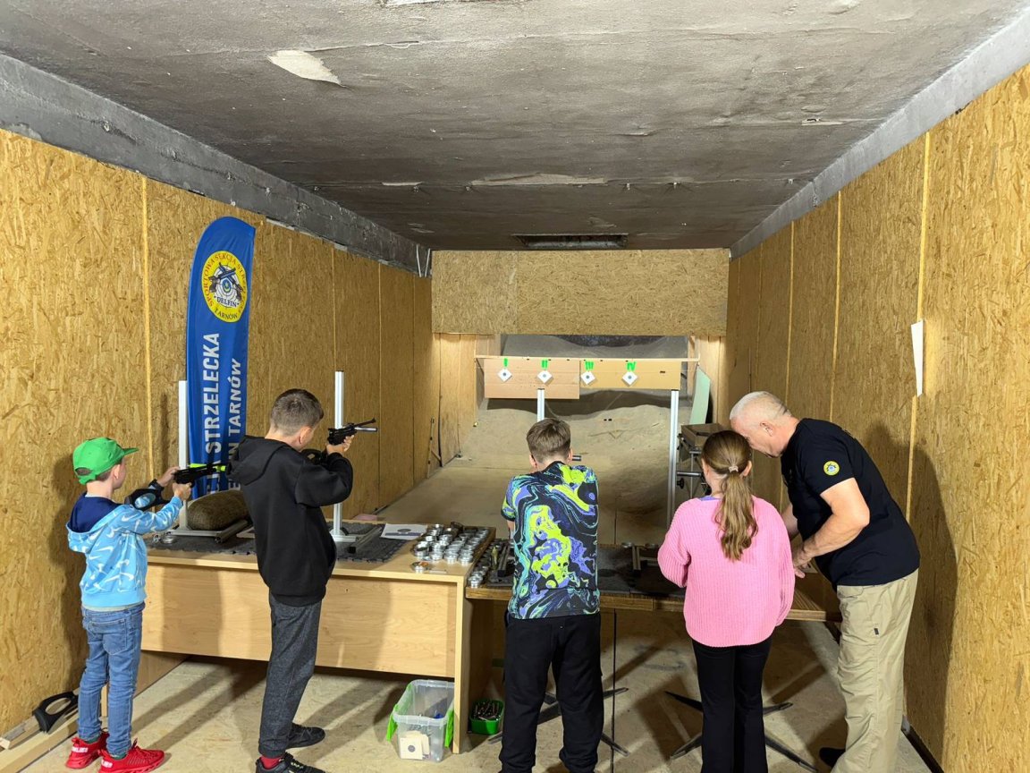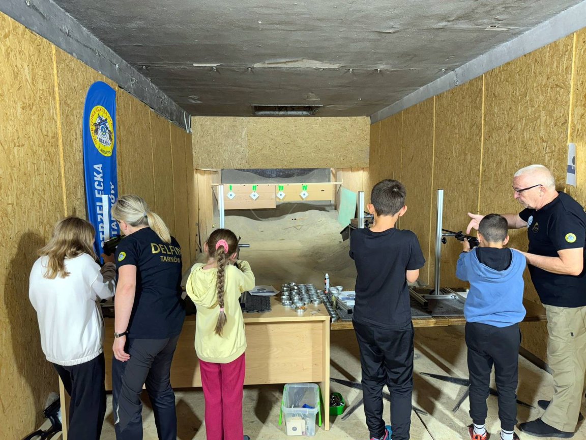 Po seansie oglądali wystawę "Zachwyt II" prof. Piotra Bożka wybitnego przedstawiciela sztuki kinetycznej w Polsce. Pozostali półkoloniści wzięłi udział w zajęciach na strzelnicy DELFIN w Tarnowie. Pod okiem instruktorów mieli okazję zapoznać się z zasadami bezpiecznego posługiwania się bronią. Zajęcia odbywały się w atmosferze skupienia i sportowej rywalizacji, a wielu uczniów wykazało się dużą precyzją.