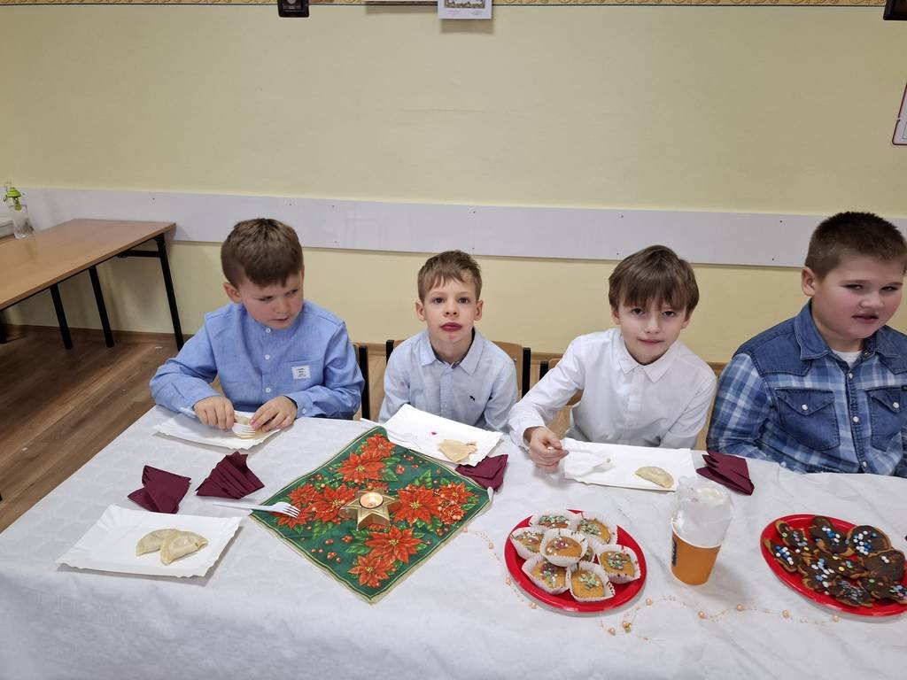 Sami nakryliśmy białym obrusem stoły, na którym znalazło się sianko oraz świece. W blasku choinki zebraliśmy się wszyscy wokół stołu, a nasza Pani wspólnie się z nami pomodliła. Potem wszyscy wszystkim składali najlepsze życzenia i łamaliśmy się opłatkiem. Następnie usiedliśmy przy stole, na którym znalazł się barszcz z uszkami, pierogi ruskie oraz babeczki i pierniczki. Te wszystkie smakołyki zostały przygotowane przez naszych kochanych Rodziców. Śpiewaliśmy kolędy, rozmawialiśmy. Niektórzy opowiadali o tym, jak w ich rodzinach odbywa się wieczerza wigilijna. Było nam bardzo wesoło i miło spędziliśmy czas. Już wiemy, że za rok też wspólnie zasiądziemy przy klasowym, wigilijnym stole. Wesołych świąt!