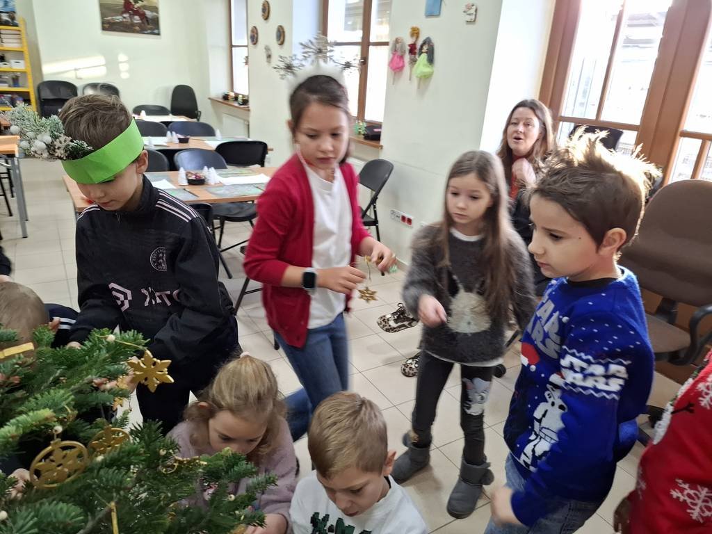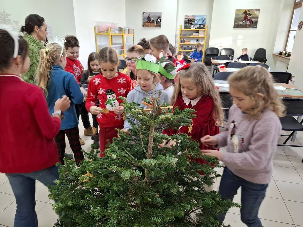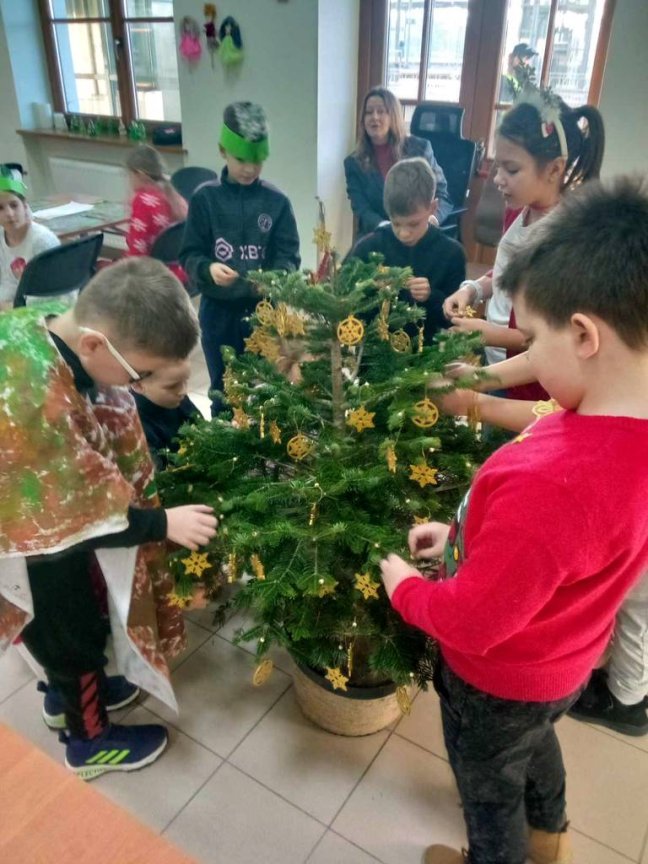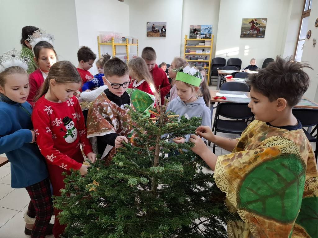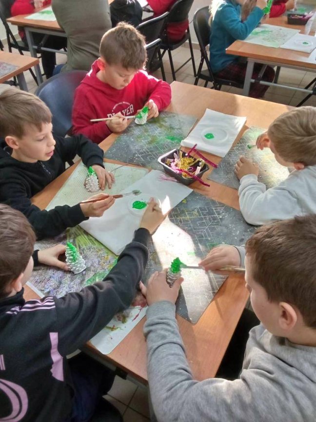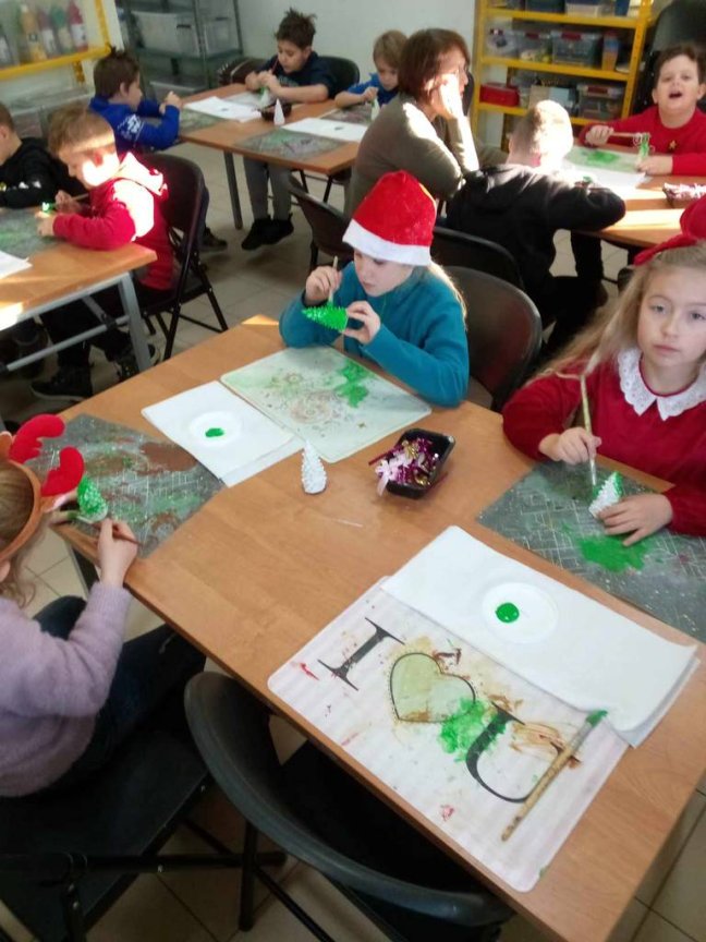 Osoby prowadzące zajęcia przedstawiły z udziałem kilku uczniów z klasy krótka scenkę rodzajową związaną ze świętami Bożego Narodzenia, które zwieńczone było wspólnym ubieraniem choinki i śpiewaniem kolęd. Na koniec warsztatów uczniowie malowali farbami akrylowymi 10-cio centymetrową choinkę gipsową oraz ozdabiali ją najrozmaitszymi ozdobami.