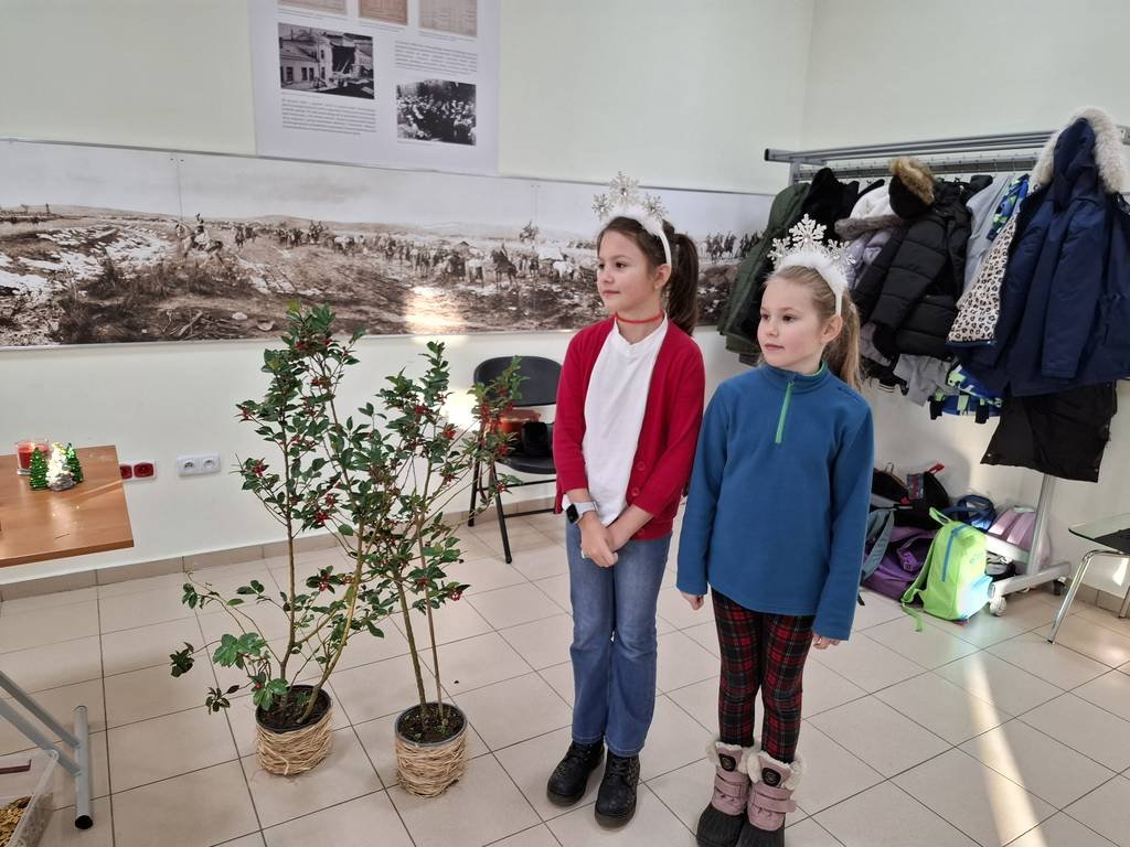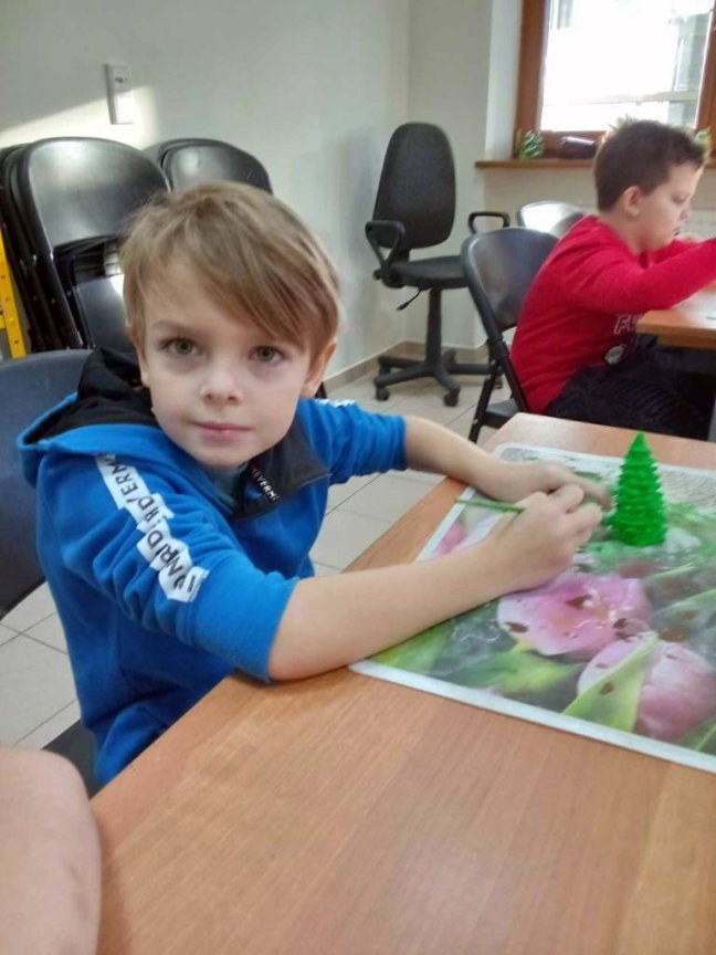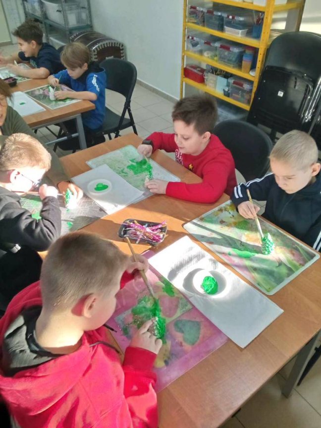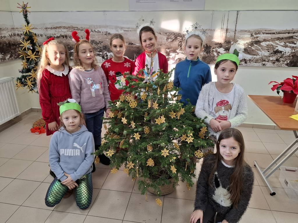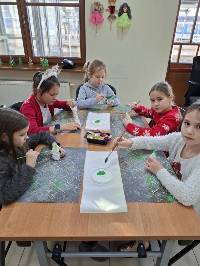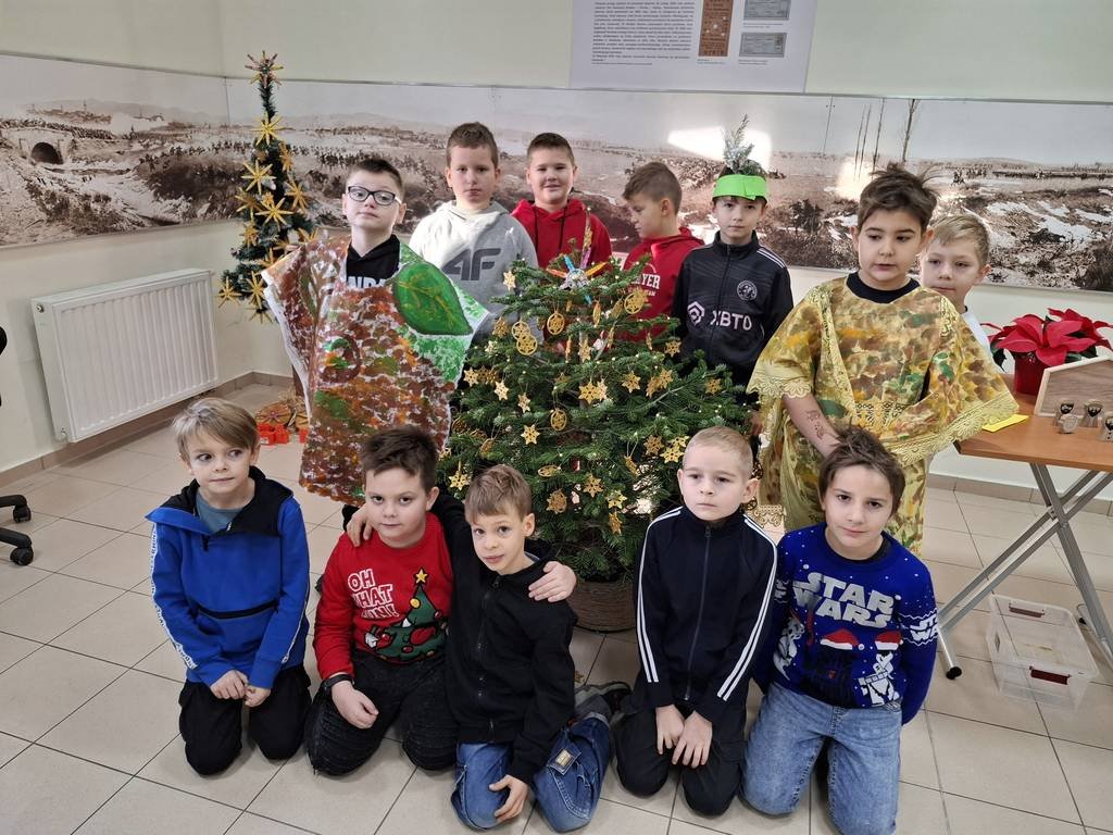 Osoby prowadzące zajęcia przedstawiły z udziałem kilku uczniów z klasy krótka scenkę rodzajową związaną ze świętami Bożego Narodzenia, które zwieńczone było wspólnym ubieraniem choinki i śpiewaniem kolęd. Na koniec warsztatów uczniowie malowali farbami akrylowymi 10-cio centymetrową choinkę gipsową oraz ozdabiali ją najrozmaitszymi ozdobami.