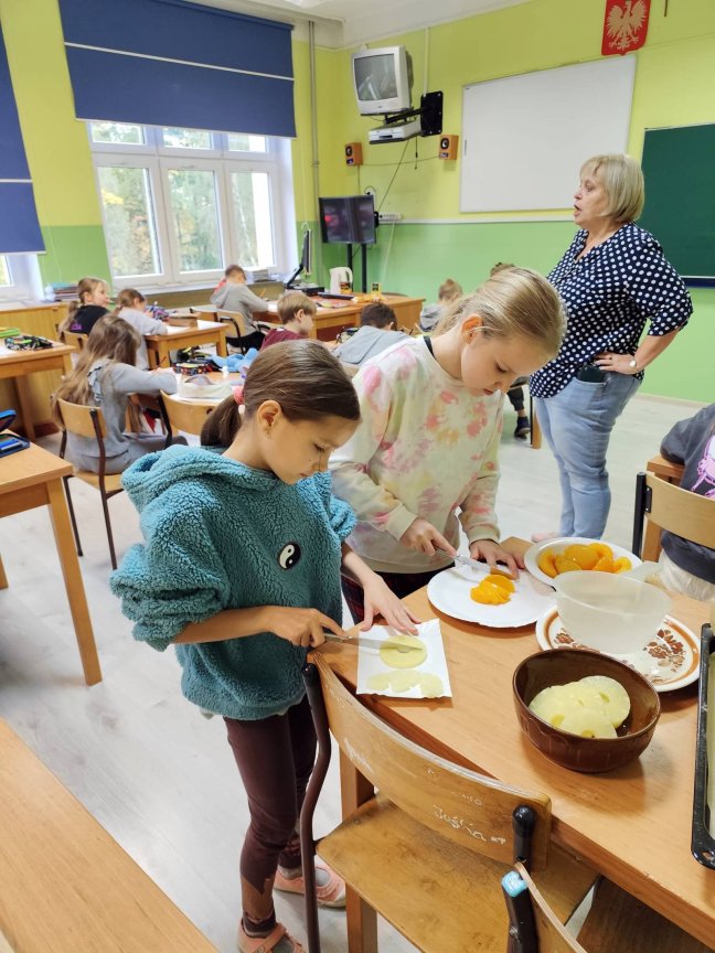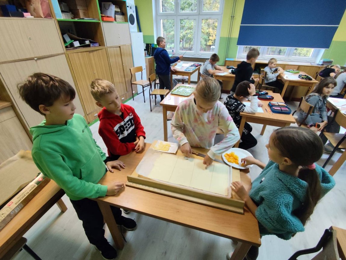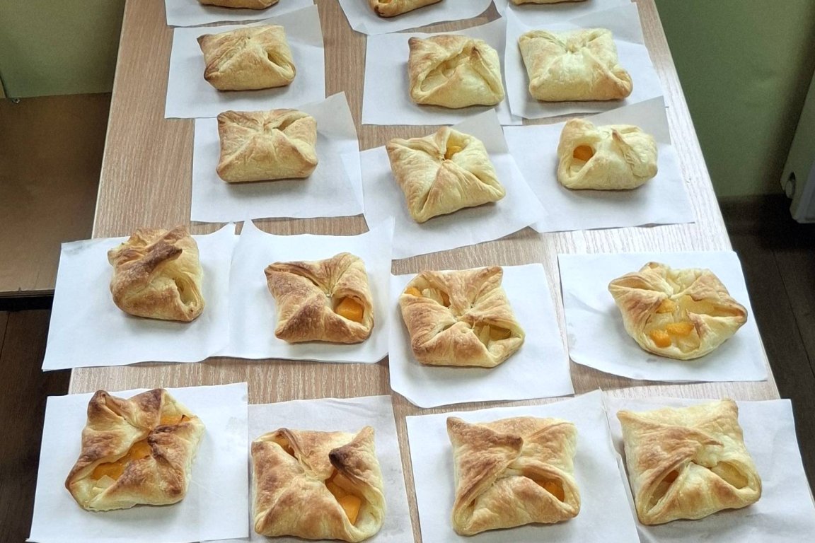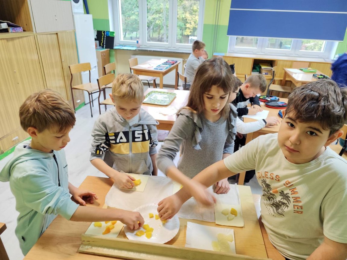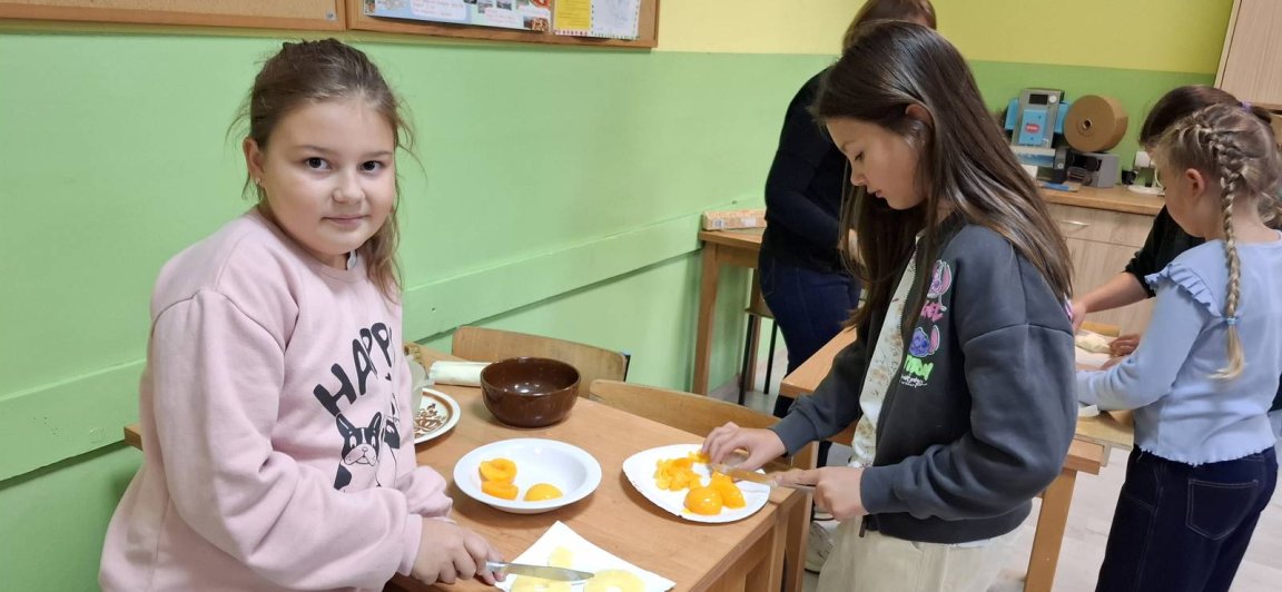 Podczas zajęć kulinarnych uczniowie upiekli smaczne " Ciastka francuskie z owocami". Na tych zajęciach uczniowie uczyli się krojenia owoców, a także formowania ciastek przez zwijanie brzegów ciasta w rogi. Po upieczeniu się owocowych ciastek nastąpiła wspólna degustacja.