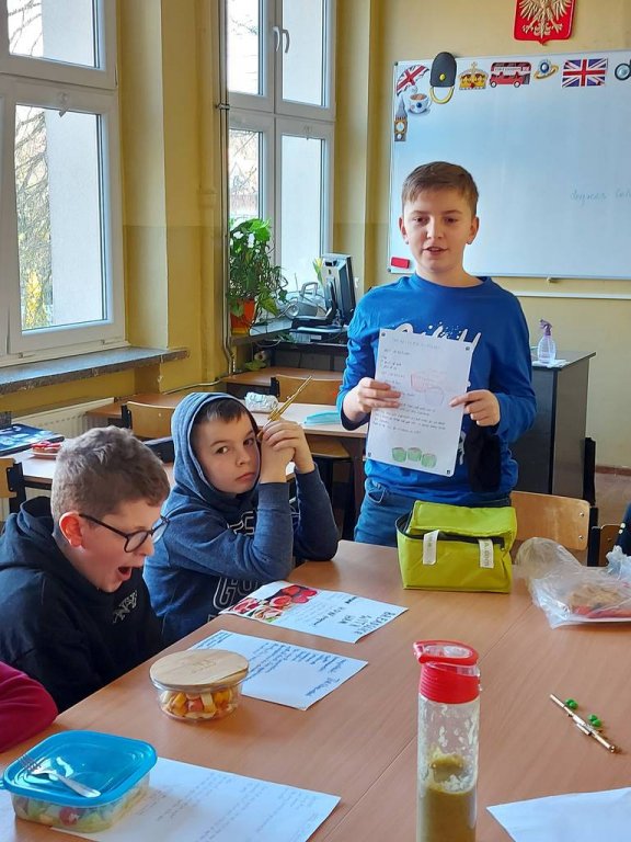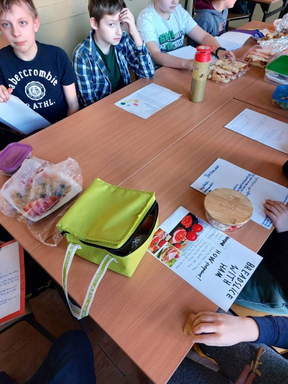 W związku z omawianymi ostatnio tematami jedzenia oraz przyrządzania posiłków uczniowie mieli za zadanie przygotować sami lub z niewielką pomocą dorosłego dowolne danie, przynieść je oraz zaprezentować przepis po angielsku. Nerwy oczywiście były, ale za to smakowita uczta wynagrodziła stres. Dania wyglądały znakomicie i o dziwo największą furorę zrobiły nie słodkości, ale „nachos z guacamole", po tym jak zdecydowana większość przyznała się, iż nigdy w życiu nie próbowała awokado.