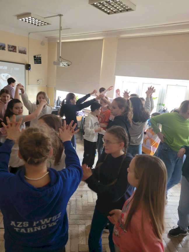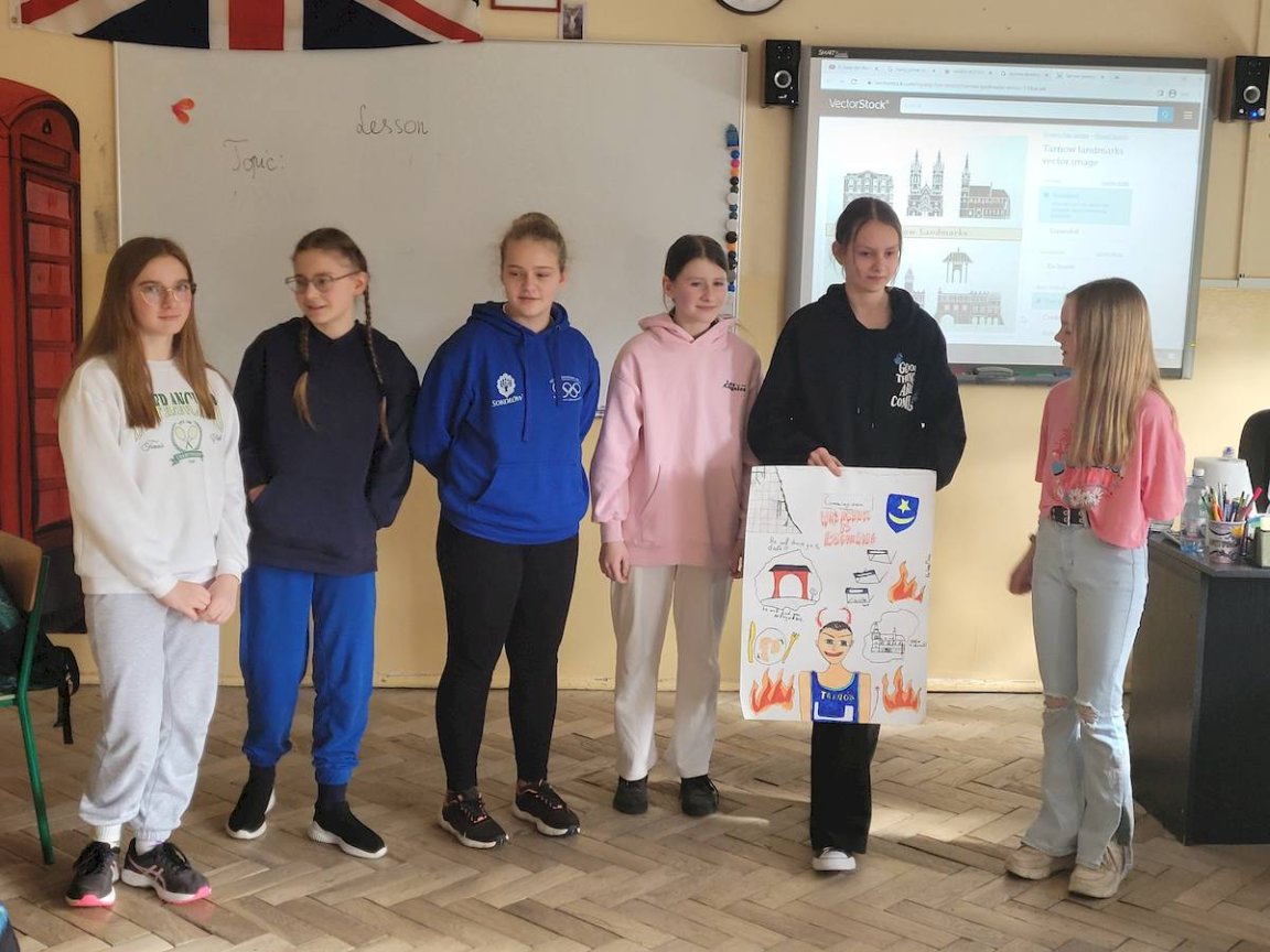 Przez 2 dni nasi goście prowadzili zajęcia z naszymi uczniami w języku angielskim. Młodzież miała okazję dowiedzieć się wielu ciekawych rzeczy o wyżej wymienionych krajach oraz poznać kilka słów w ich ojczystych językach. Ponadto były gry, zabawy ruchowe i językowe,wspólne tańce i śpiewy oraz projekty. We wtorek po południu uczniowie kl.8 udali się na krótki spacer po Tarnowie a następnie mieli okazję poćwiczyć swój angielski przy ciastku i herbatce.